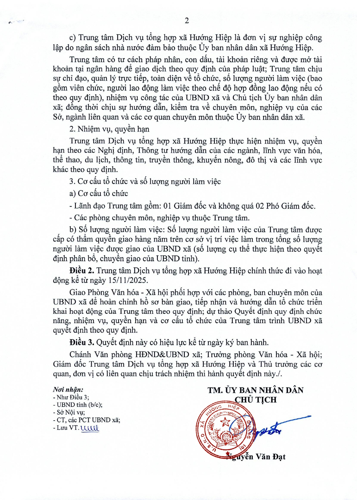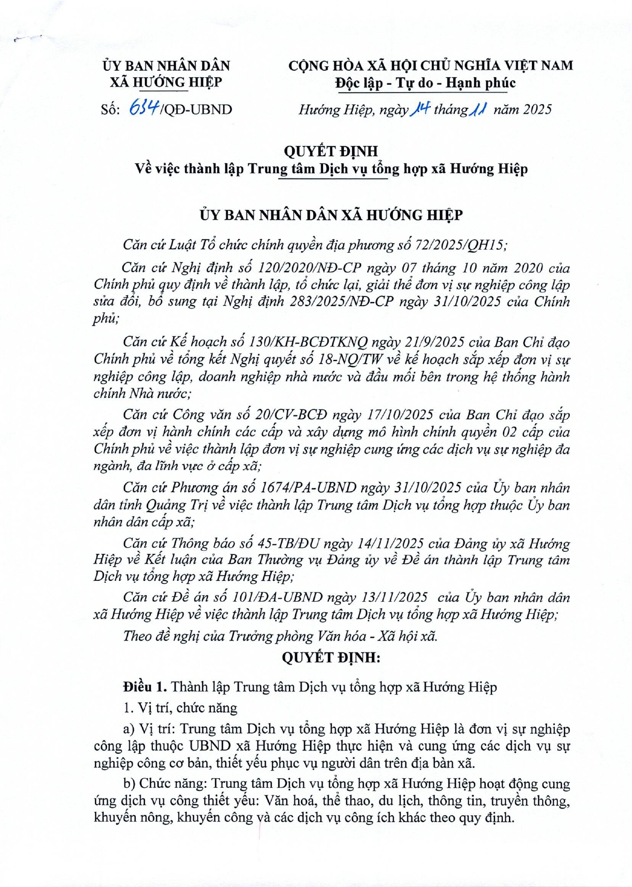 Căn cứ Phương án số 1674/PA-UBND ngày 31/10/2025 của UBND tỉnh Quảng Trị về việc thành lập Trung tâm Dịch vụ tổng hợp thuộc UBND cấp xã; Đề án số 101/ĐA-UBND về thành lập Trung tâm Dịch vụ tổng hợp xã Hướng Hiệp. Ngày 14/11/2025 UBND xã Hướng Hiệp ban hành Quyết định số 634/QĐ-UBND về thành lập Trung tâm Dịch vụ tổng hợp xã Hướng Hiệp.
