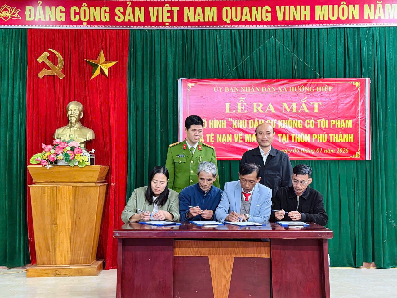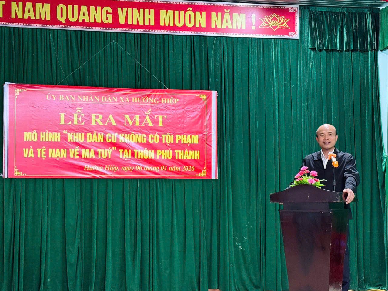 Tối ngày 06/01/2026, tại thôn Phú Thành, Công an xã Hướng Hiệp tham mưu cho UBND xã Hướng Hiệp tổ chức Lễ ra mắt mô hình “Khu dân cư không có tội phạm và tệ nạn về ma túy”. Tham dự buổi lễ có đồng chí Nguyễn Văn Đạt - Chủ tịch UBND xã Hướng Hiệp; đồng chí Trung tá Lê Hoàng Trung - Trưởng Công an xã, cùng các đồng chí trong Ban Chỉ huy Công an xã, đại diện các ban, ngành, đoàn thể và đông đảo Nhân dân trên địa bàn thôn Phú Thành.