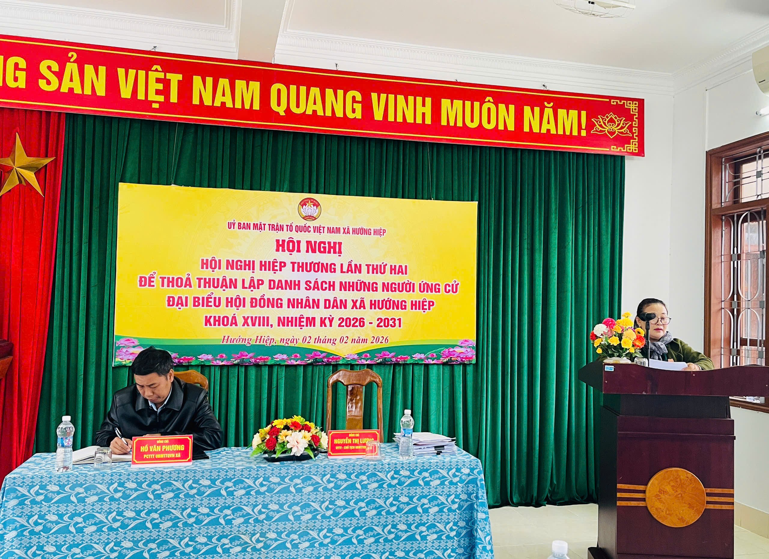 Ngày 02/02/2026, Ban Thường trực Ủy ban MTTQ Việt Nam xã Hướng Hiệp tổ chức Hội nghị hiệp thương lần thứ hai nhằm thỏa thuận lập danh sách những người ứng cử đại biểu Hội đồng nhân dân xã Hướng Hiệp khóa XVIII, nhiệm kỳ 2026–2031, bảo đảm đúng quy trình, dân chủ, công khai và theo quy định của pháp luật về bầu cử. Tham dự có đồng chí Thái Ngọc Châu - Bí thư Đảng ủy, Chủ tịch HĐND xã Hướng Hiệp chủ trì hội nghị , đồng chí Nguyễn Văn Đạt - Chủ tịch UBND xã, đồng chí Nguyễn Thị Lượng - Chủ tịch UMTTQVN xã, cùng các đồng chí trong Ban Thường trực MTTQ xã, đại diện các tổ chức thành viên, các ban, ngành, đoàn thể và Trưởng Ban công tác Mặt trận các thôn, khóm.