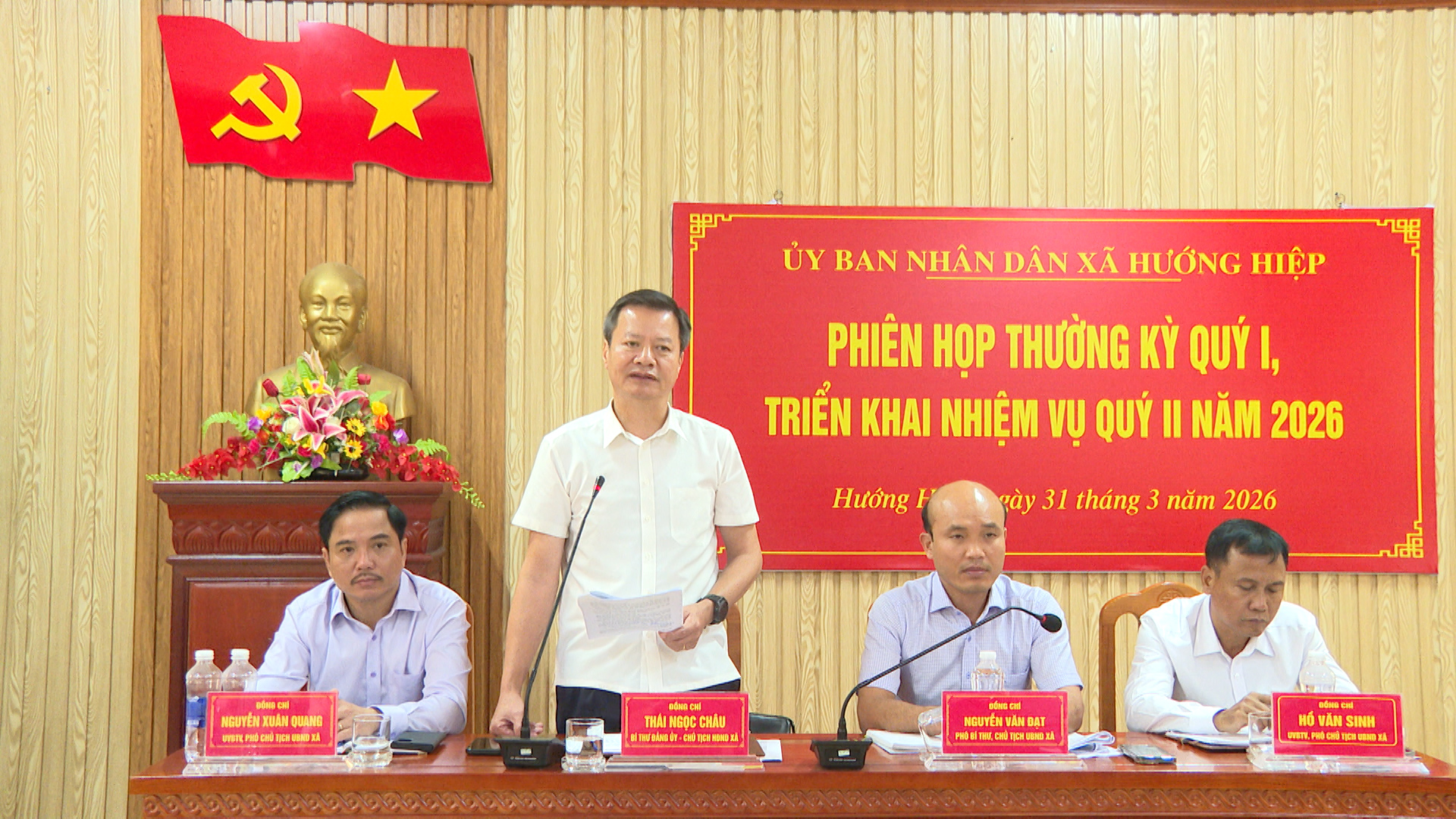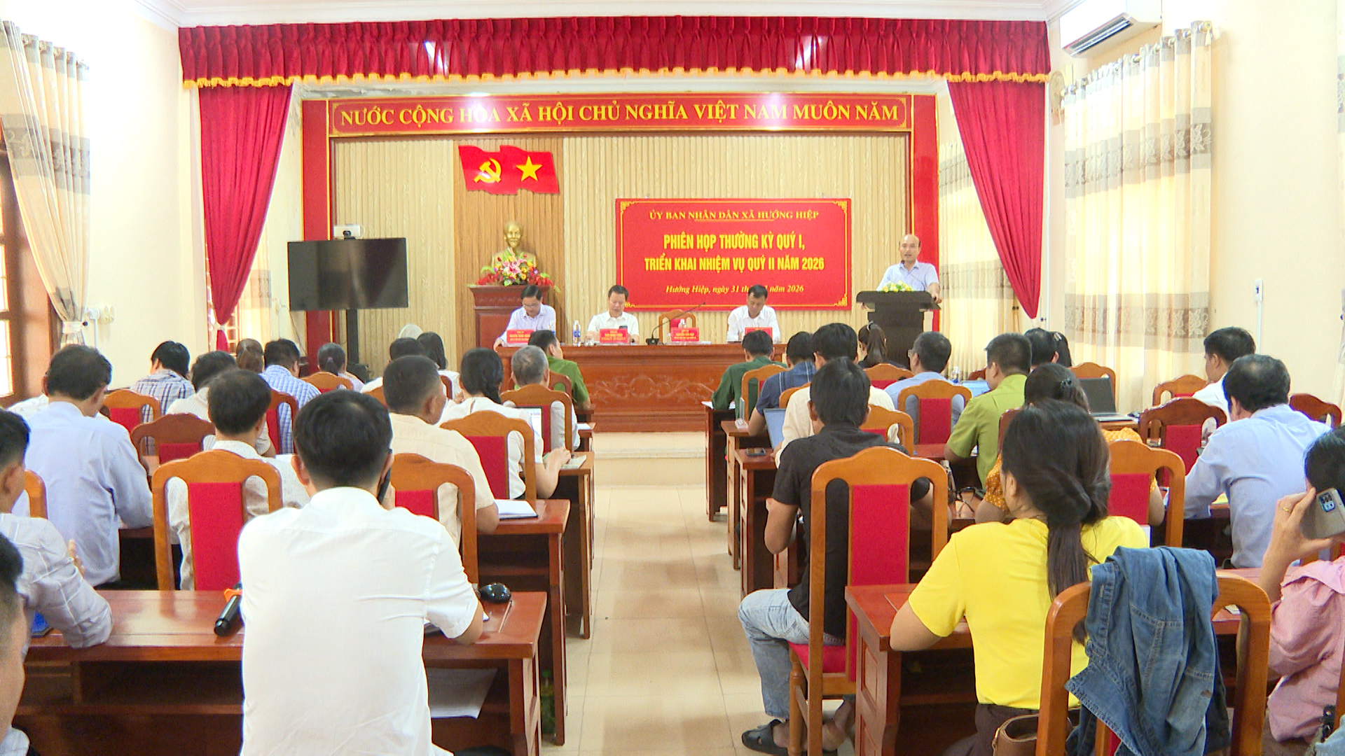 Ngày 31/3, UBND xã Hướng Hiệp tổ chức phiên họp thường kỳ quý I nhằm đánh giá tình hình kinh tế - xã hội, quốc phòng – an ninh quý I, nhiệm vụ trọng tâm quý II/2026. Tham dự và phát biểu chỉ đạo có đồng chí Thái Ngọc Châu – Bí thư Đảng ủy, Chủ tịch HĐND xã; đại diện lãnh đạo các cơ quan, ban, ngành, đoàn thể xã; trưởng các thôn, khóm trên địa bàn. Tập thể lãnh đạo UBND xã chủ trì phiên họp.