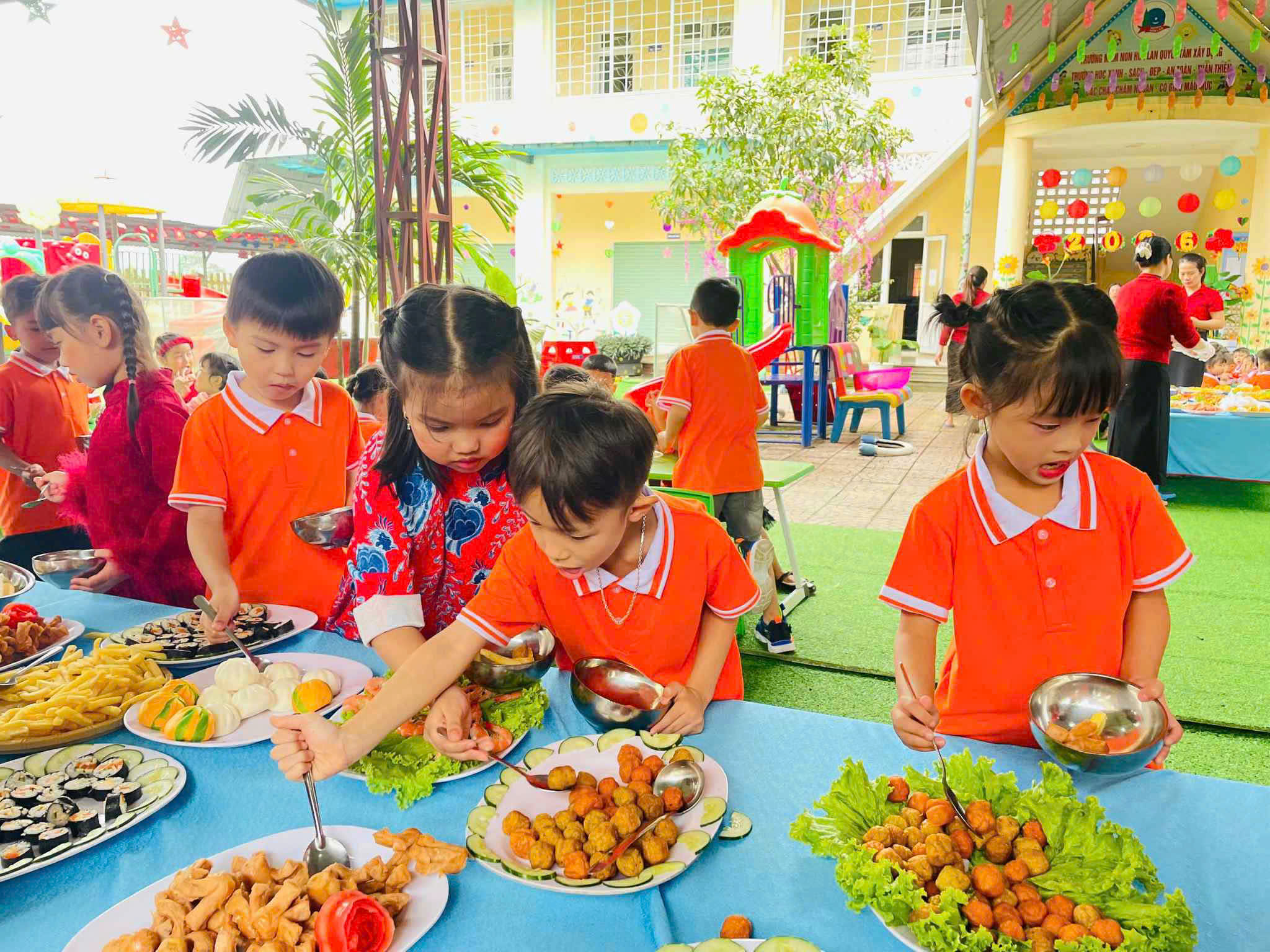 Ngày 06/02, Trường Mầm non Hoa Lan đã tổ chức chương trình “Tết sum vầy - Xuân yêu thương” cho các cháu trong không khí vui tươi, ấm áp, đậm đà bản sắc văn hóa Tết cổ truyền dân tộc, thu hút sự tham gia hào hứng của các bé, giáo viên và phụ huynh. Tại chương trình, các cháu được tham gia biểu diễn và giao lưu văn nghệ chào xuân với nhiều tiết mục đặc sắc, hồn nhiên, sôi động. Bên cạnh đó, nhà trường còn tổ chức hoạt động trải nghiệm bữa tiệc buffet được chuẩn bị chu đáo, phong phú với nhiều món ăn phù hợp lứa tuổi. Các cô giáo trực tiếp chăm chút từng khâu chuẩn bị, từ trang trí không gian, sắp xếp món ăn đến hướng dẫn, hỗ trợ các bé trong suốt quá trình dùng bữa, tạo cảm giác gần gũi, an toàn và thân thiện. Không khí bữa ăn diễn ra vui vẻ, nề nếp, giúp trẻ thêm hứng thú và mạnh dạn trong giao tiếp.