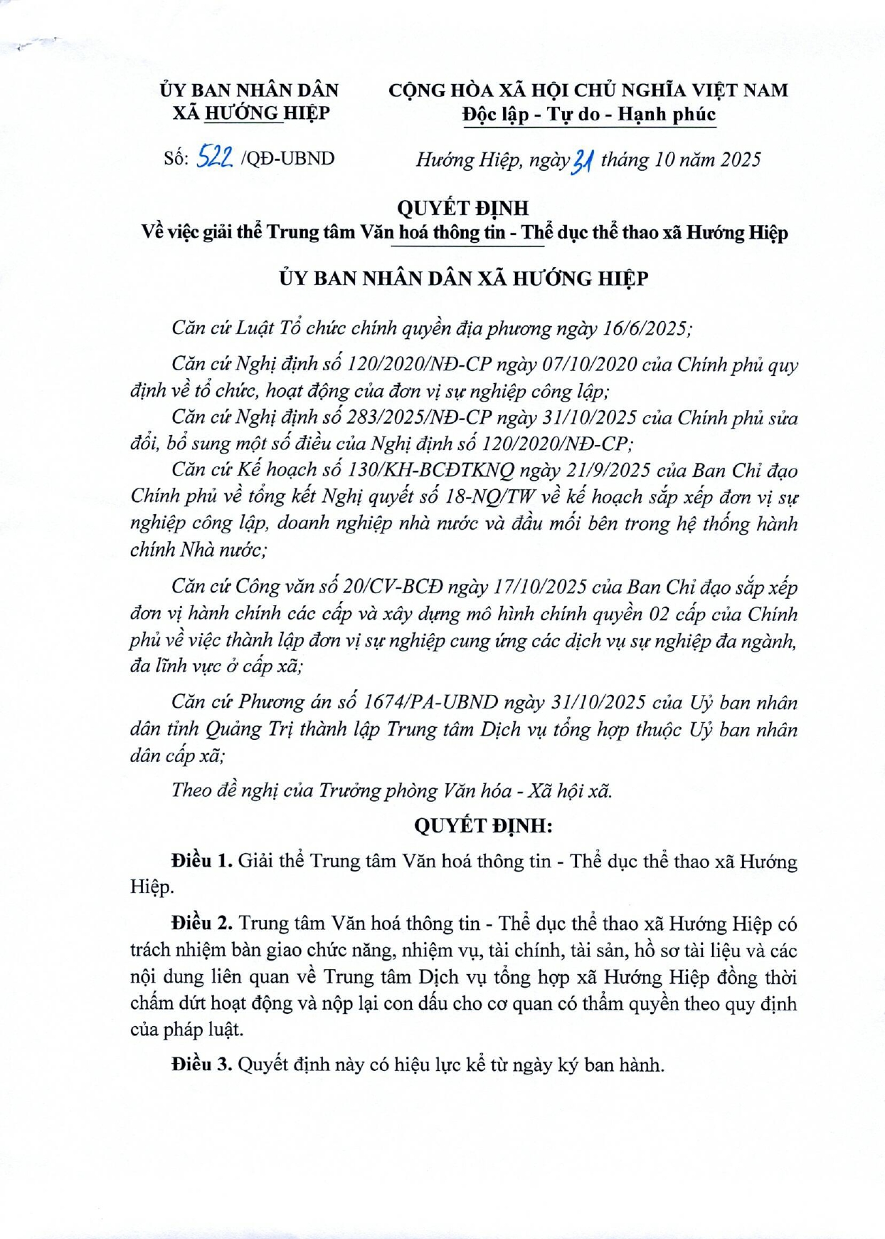 Căn cứ Phương án số 1674/PA-UBND ngày 31/10/2025 của UBND tỉnh Quảng Trị về việc thành lập Trung tâm Dịch vụ tổng hợp thuộc UBND cấp xã. Ngày 31/10/2025 UBND xã Hướng Hiệp ban hành Quyết định số 522/QĐ-UBND về việc giải thể Trung tâm VHTT-TDTT xã Hướng Hiệp.