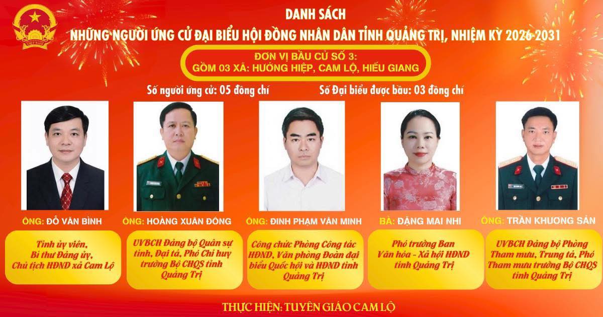 Danh sách và tiểu sử tóm tắt những người ứng cử đại biểu HĐND tỉnh Quảng Trị, nhiệm kỳ 2026-2031 đơn vị bầu cử số 3 gồm 3 xã: Cam Lộ, Hiếu Giang, Hướng Hiệp
