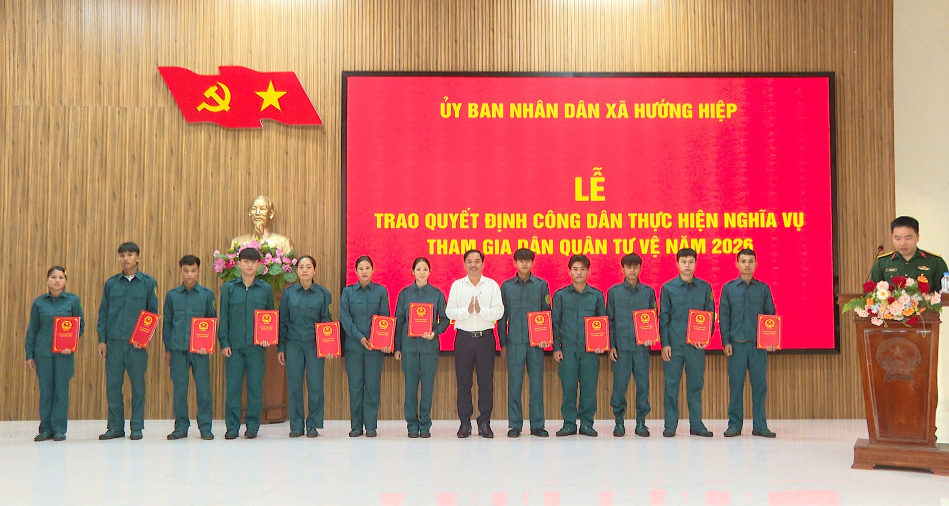 Tại buổi lễ, BCH Quân sự xã Hướng Hiệp đã công bố và trao quyết định công dân thực hiện nghĩa vụ tham gia Dân quân Tự vệ năm 2026 cho 37 công dân trên địa bàn. Đây đều là những công dân trẻ tiêu biểu, có đủ phẩm chất chính trị, đạo đức, sức khỏe và tinh thần trách nhiệm, sẵn sàng tham gia thực hiện nhiệm vụ quốc phòng - an ninh tại địa phương.