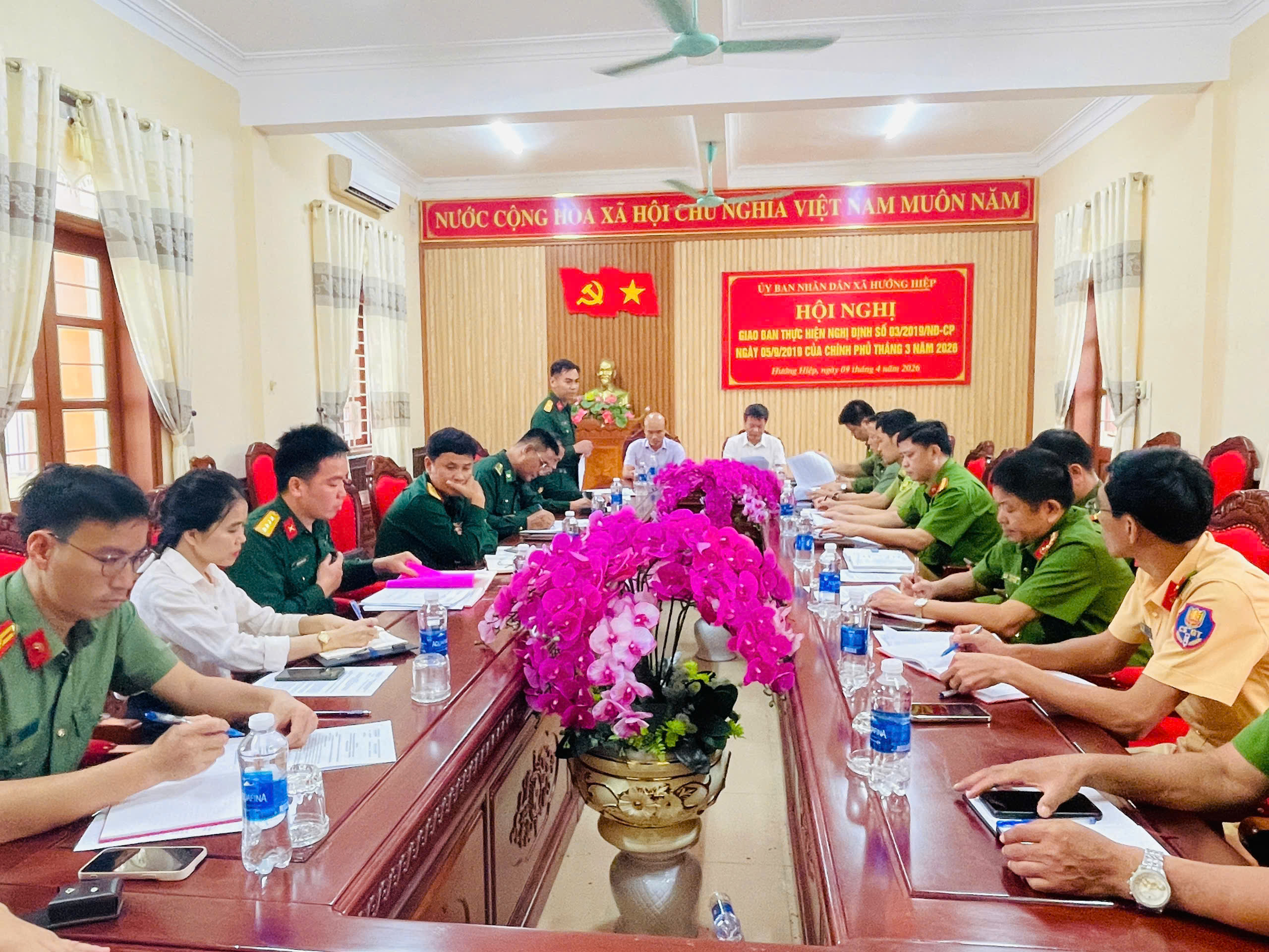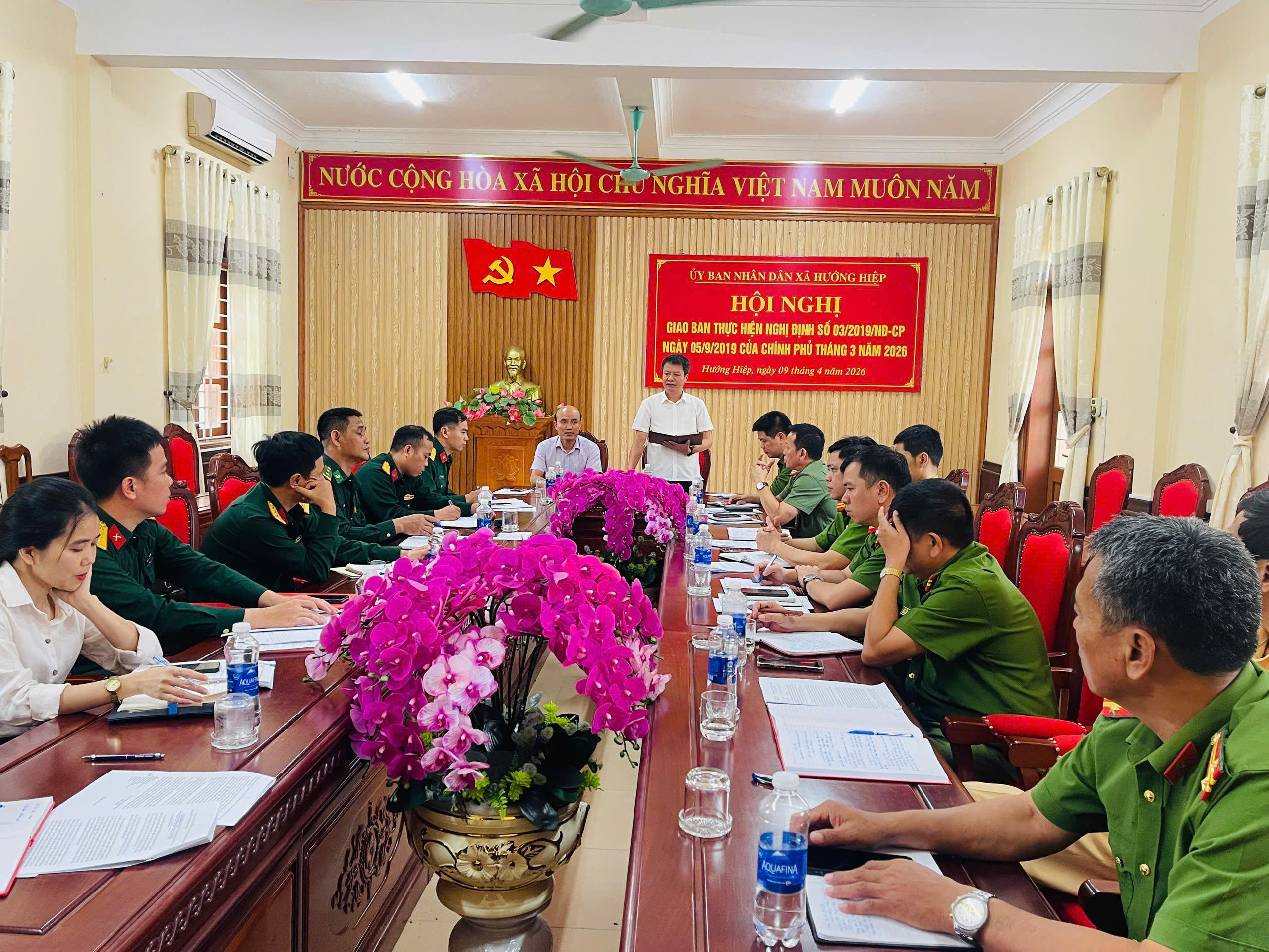 Ngày 9/4/2026, UBND xã Hướng Hiệp tổ chức Hội nghị giao nhằm đánh giá kết quả phối hợp thực hiện Nghị định số 03/2019/NĐ-CP của Chính phủ trong quý I năm 2026. Đồng chí Thái Ngọc Châu, Bí thư Đảng ủy - Chủ tịch HĐND xã; Đồng chí Nguyễn Văn Đạt, Phó Bí thư - Chủ tịch UBND dự và phát biểu chỉ đạo.