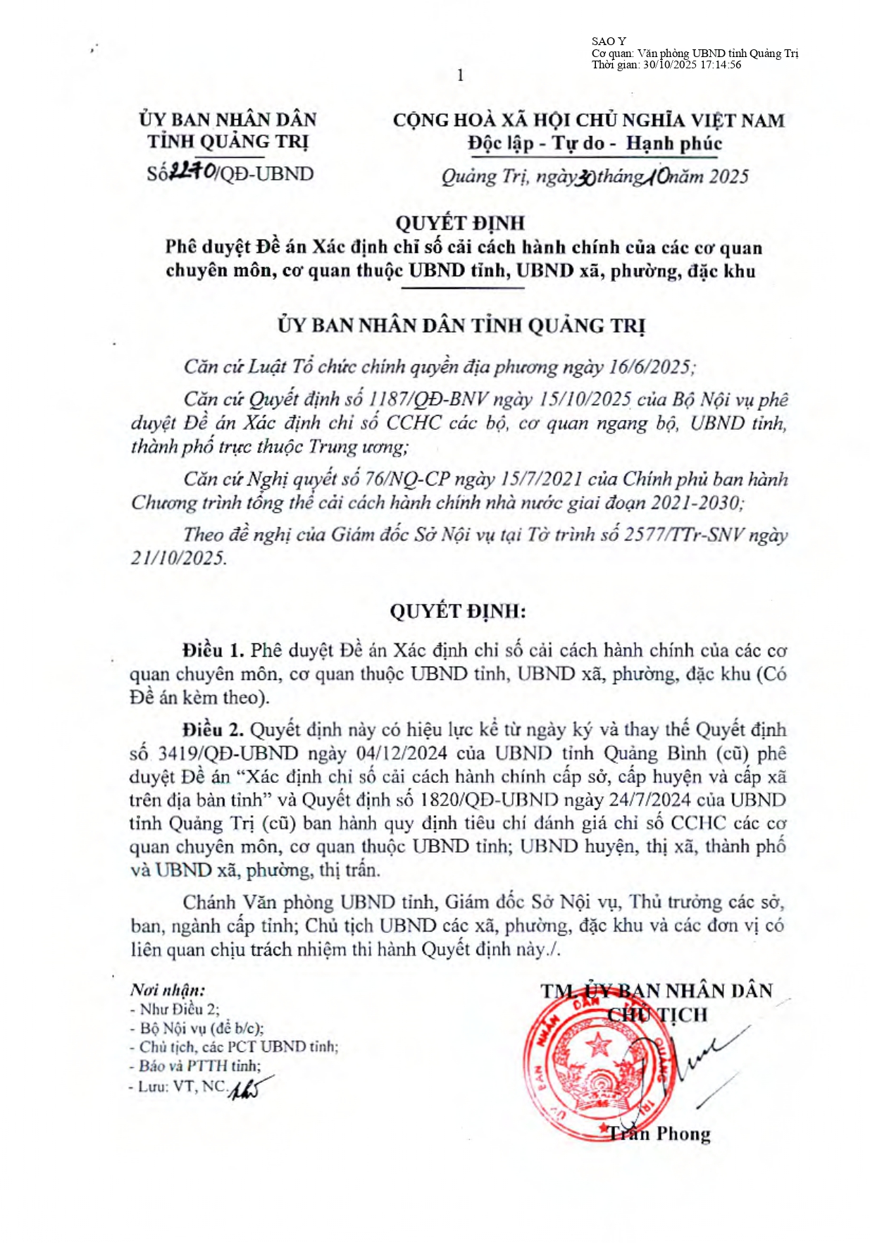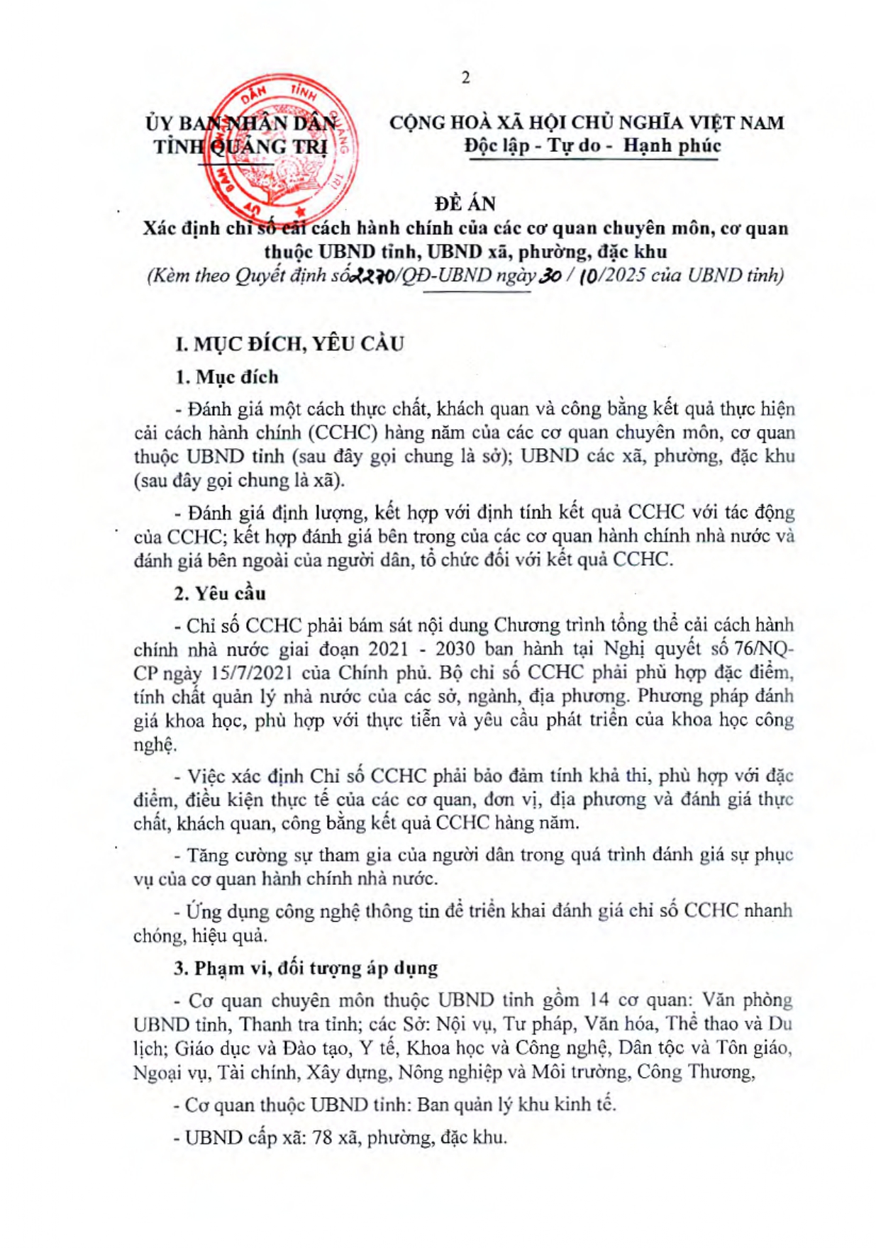 Ngày 30/10/2025, UBND tỉnh Quảng Trị đã ban hành Quyết định số 2270/QĐ-UBND phê duyệt Đề án xác định Chỉ số cải cách hành chính của các cơ quan chuyên môn, cơ quan thuộc UBND tỉnh và UBND xã, phường, đặc khu (gọi chung là cấp xã).