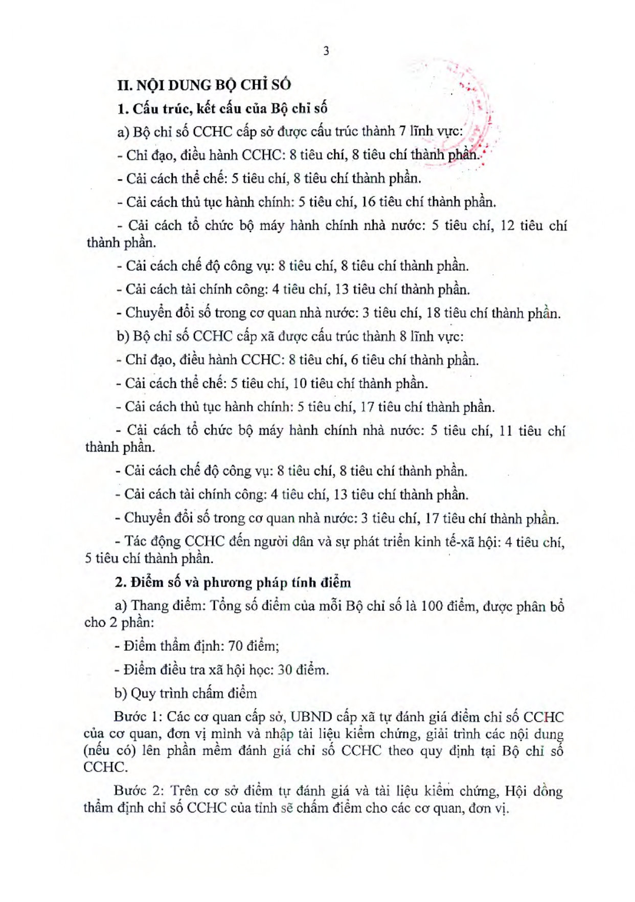 Đề án nhằm mục đích đánh giá một cách thực chất, khách quan và công bằng kết quả thực hiện CCHC hàng năm của các đơn vị. Theo Đề án, đối tượng áp dụng bao gồm 78 xã, phường, đặc khu trên địa bàn tỉnh. Bộ chỉ số CCHC cấp xã được cấu trúc thành 8 lĩnh vực đánh giá, bao gồm: Chỉ đạo, điều hành CCHC; Cải cách thể chế; Cải cách thủ tục hành chính; Cải cách tổ chức bộ máy hành chính nhà nước; Cải cách chế độ công vụ; Cải cách tài chính công; Chuyển đổi số trong cơ quan nhà nước; và Tác động CCHC đến người dân và sự phát triển kinh tế- xã hội. Tổng thang điểm là 100 điểm, trong đó 70 điểm là điểm thẩm định và 30 điểm là điểm điều tra xã hội học. Đáng chú ý, việc điều tra xã hội học đối với cấp xã sẽ lấy ý kiến của 4 nhóm đối tượng: Đại biểu HĐND cấp xã; lãnh đạo và trưởng, phó phòng thuộc UBND cấp xã và người dân có giao dịch thủ tục hành chính.