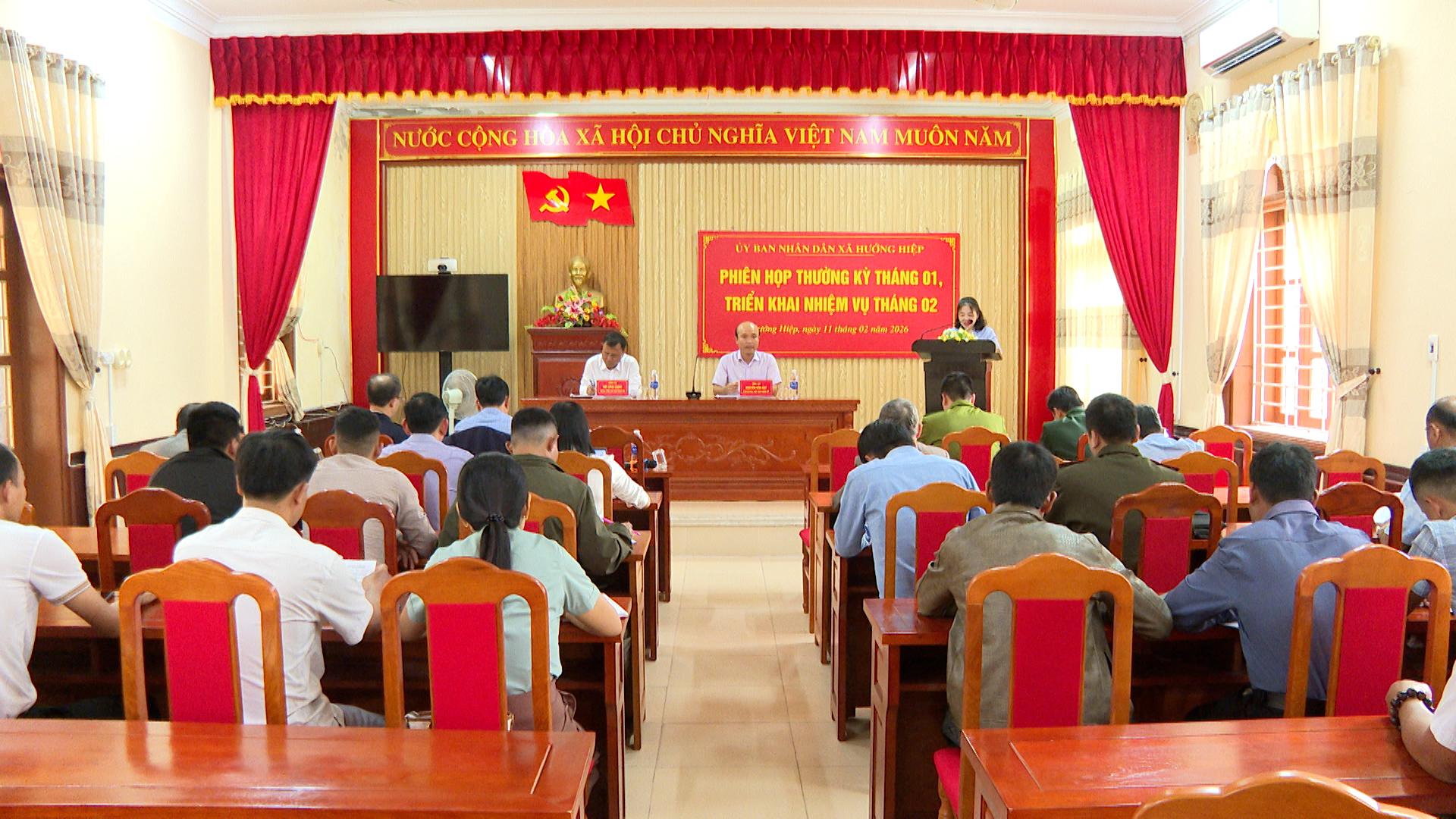 Chiều ngày 11/2/2026, UBND xã Hướng Hiệp tổ chức phiên họp thường kỳ tháng 1 nhằm đánh giá tình kinh tế - xã hội, quốc phòng an ninh trong tháng và triển khai nhiệm vụ tháng 2. Tập thể lãnh đạo UBND xã chủ trì phiên họp, tham dự phiên họp có đại diện các lãnh đạo các ban, ngành xã; trưởng các thôn khóm trên địa bàn.